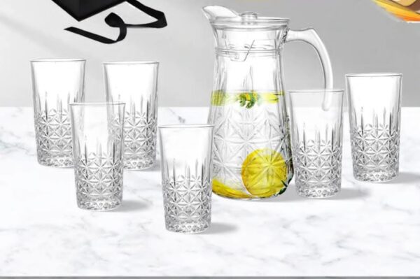 7pc Water glass Set ▪️ Capacity: 1.8ltrs and 300ml ▪️ Material: glass ▪️Contains: 6 glasses and 1jar